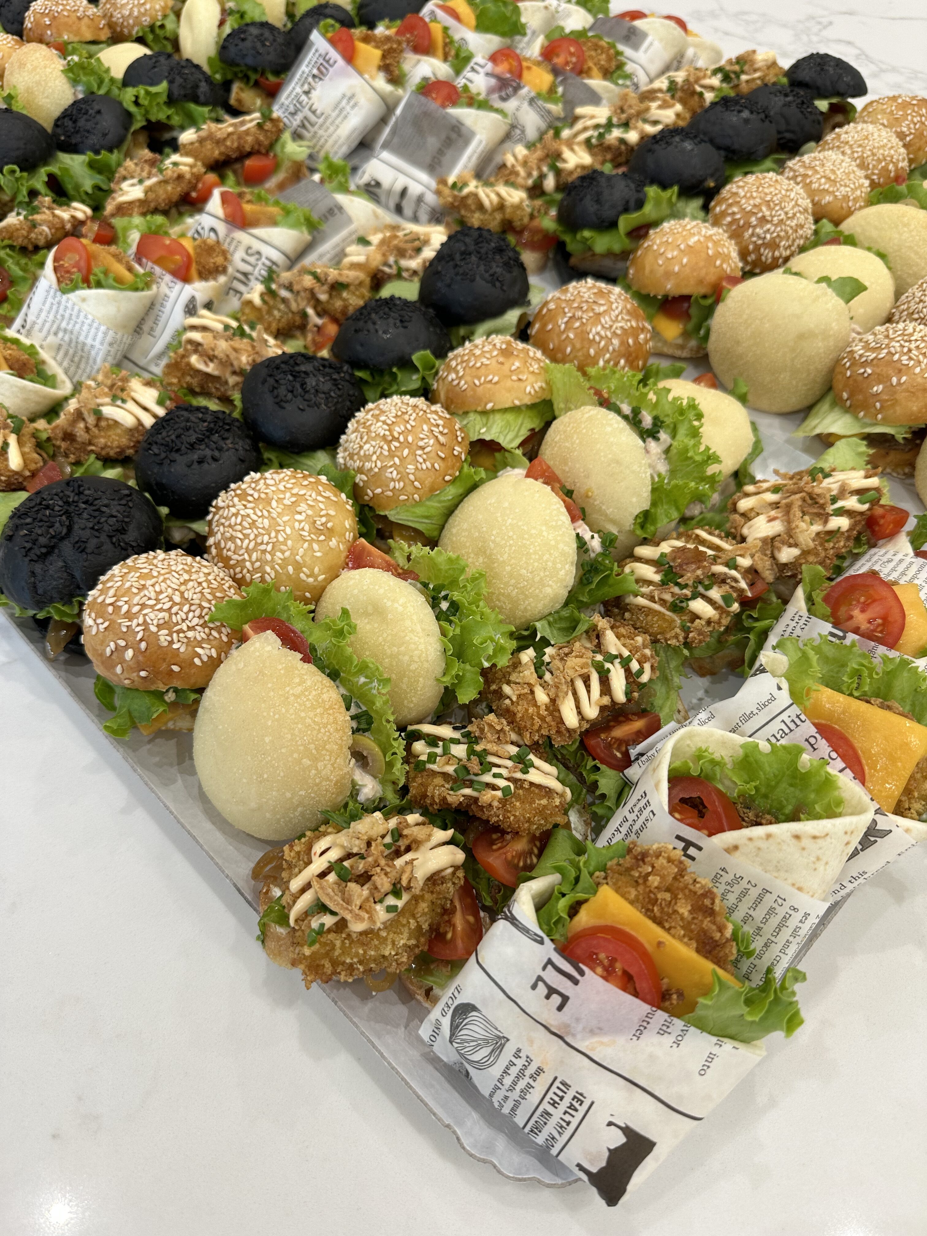 Galette de blé garni de poulet, crudités, oignons et sauce dynamite